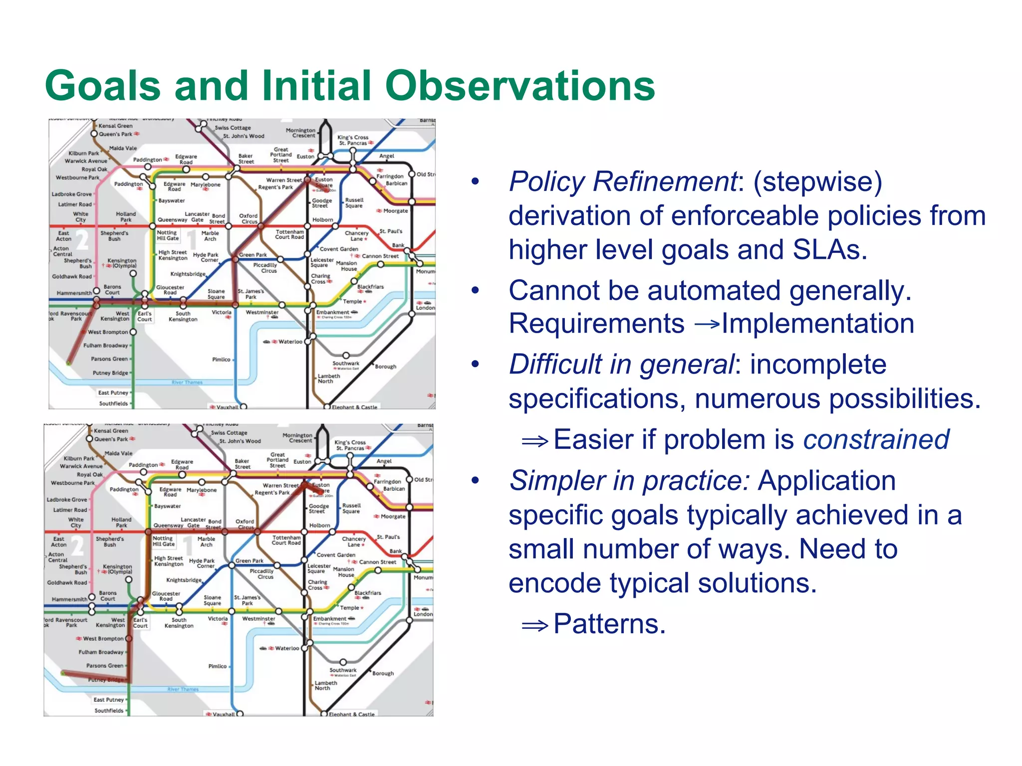 This document discusses an approach to policy refinement and analysis using goal decomposition, abductive reasoning, and formal representations of policies and managed objects. The approach involves decomposing high-level goals into refined policies using patterns, and applying abductive reasoning to derive policy elements and ensure consistency during refinement. Formal models of policies, goals, and managed objects are used to enable analysis, validation, and detect conflicts. The approach provides explanations for refinement and analysis results. The document also discusses limitations and comparisons to other policy refinement techniques.