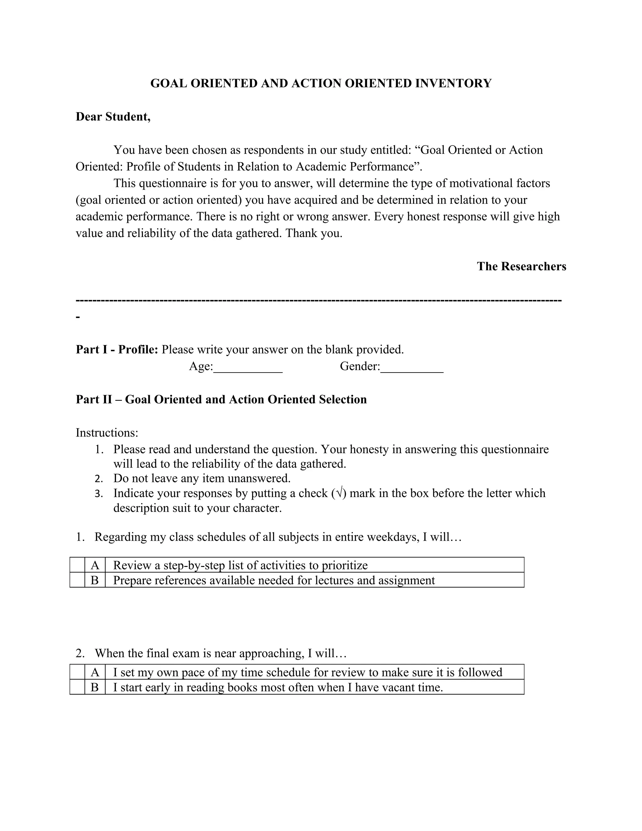 The document is a questionnaire designed for students participating in a study on goal-oriented versus action-oriented motivational factors related to academic performance. It contains profile questions and a series of scenarios where respondents must select their responses based on their character traits. The researchers emphasize the importance of honesty in answers for reliable data collection.