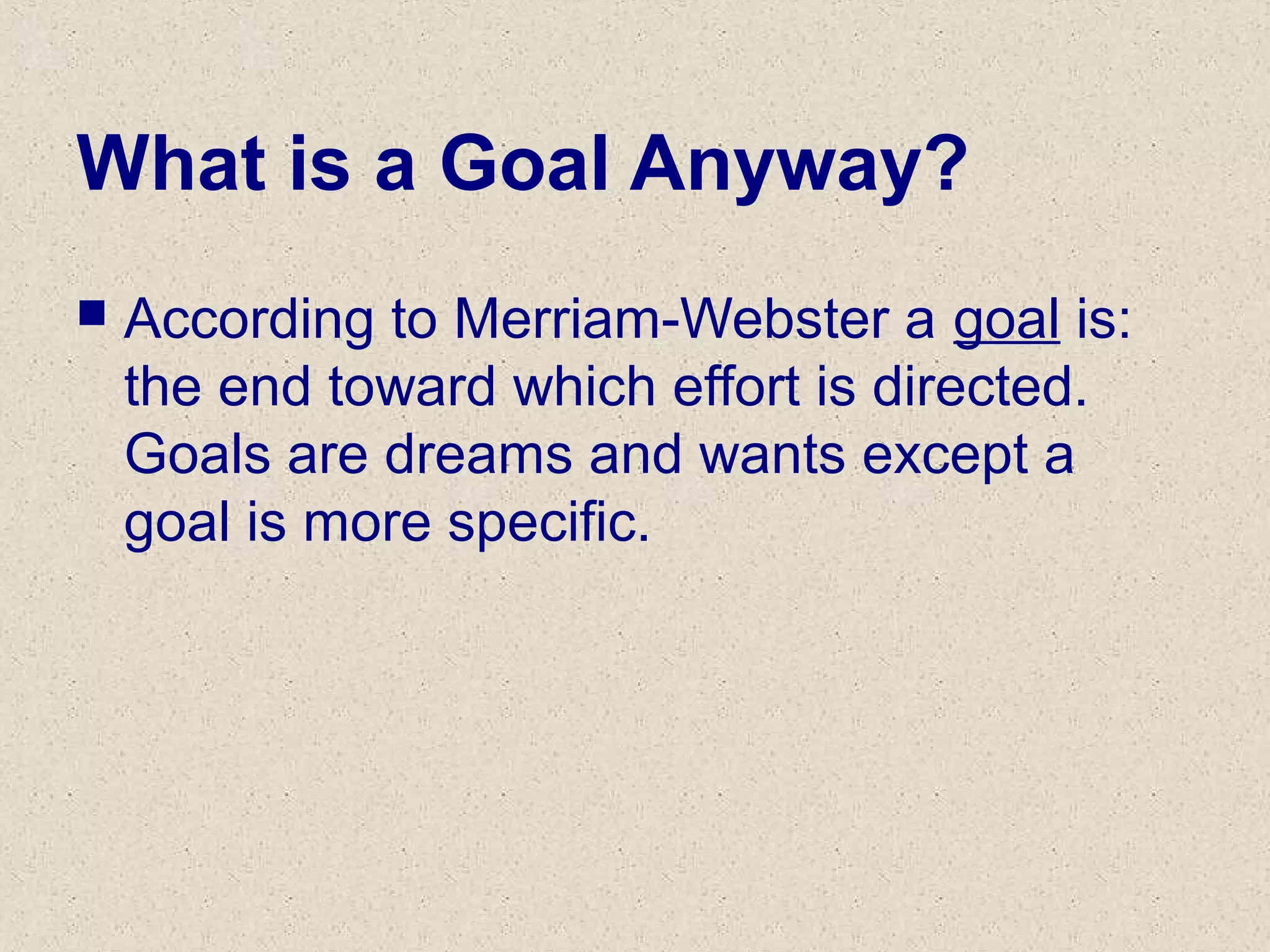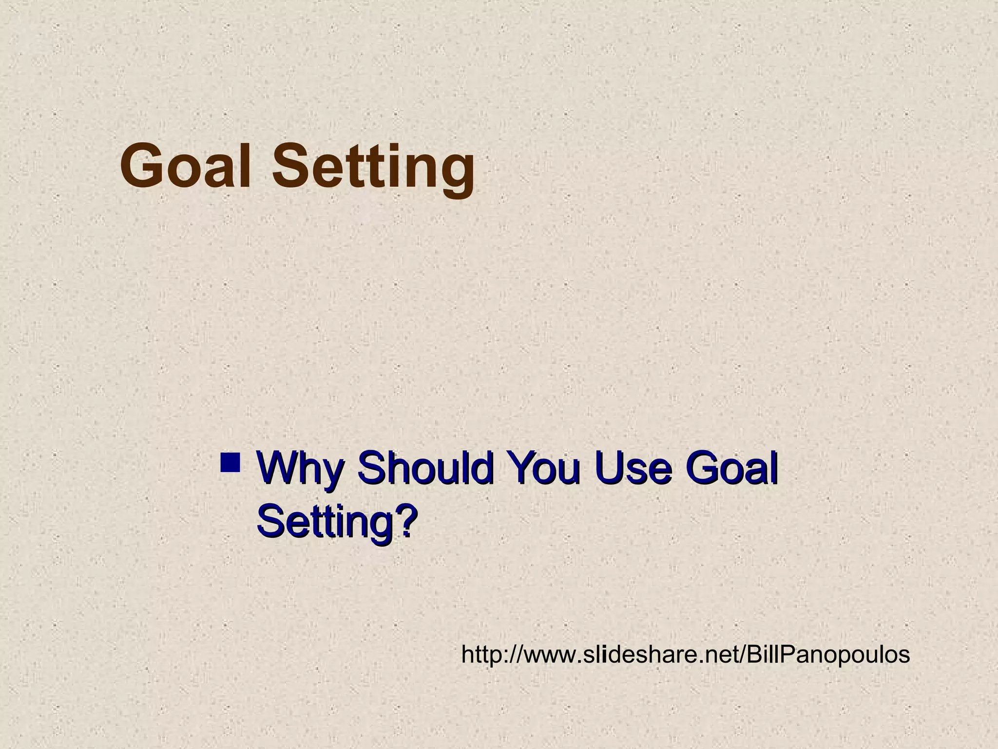 Goal setting provides direction and focus to achieve dreams and wants. Effective goals are specific, measurable, action-oriented, realistic and have a timeframe. The process of setting goals involves identifying goals, strategies to achieve them, selecting the best strategies, and making specific plans. Writing goals down commits a person to accomplishing them. Setting goals provides motivation and commitment to strive for achievement, which leads to benefits like less stress and better performance.