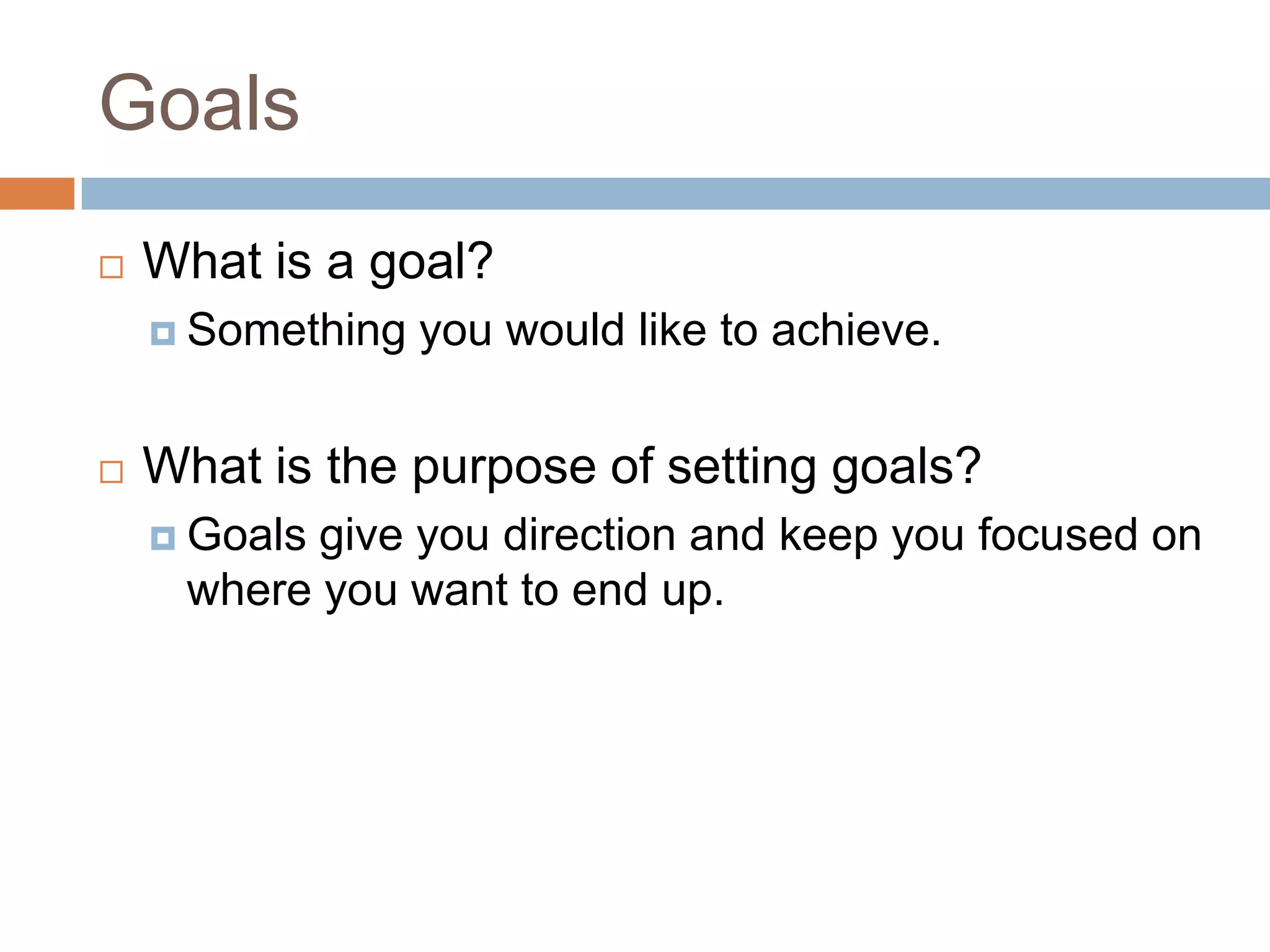 Goals provide direction and focus on where you want to end up. There are different types of goals, including short-term goals that can be achieved within weeks or months, and long-term goals that take longer, such as a year or more. Goals can also be fixed, with a specific deadline, or flexible without a set timeline. Setting unrealistic goals that are untimely, require unavailable resources, or are too general can lead to feelings of failure. Creating SMART goals helps make goals specific, measurable, achievable, relevant, and time-bound for successful achievement.
