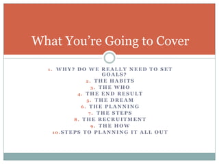 This document provides information on setting goals and developing good goal-setting habits. It discusses the importance of setting meaningful goals that motivate personal growth rather than just releasing tension. Goals should be specific, measurable, attainable, and have a defined timescale. Small, consistent steps are important for progressing toward goals. The document also discusses using affirmations and visualization to keep goals top of mind and move steadily toward the desired end result through habit and commitment. Proper planning, tracking of progress, and willingness to adjust goals are emphasized as well.