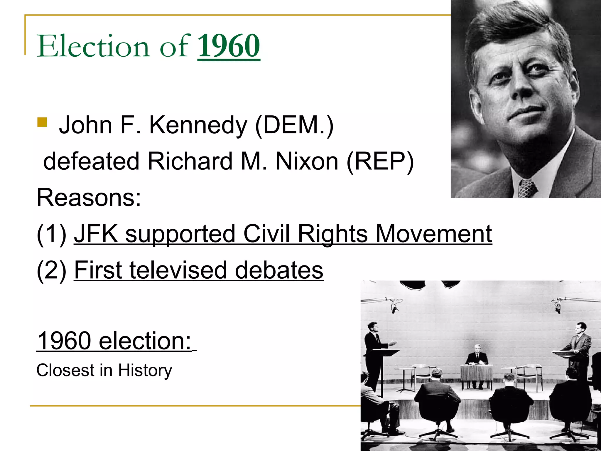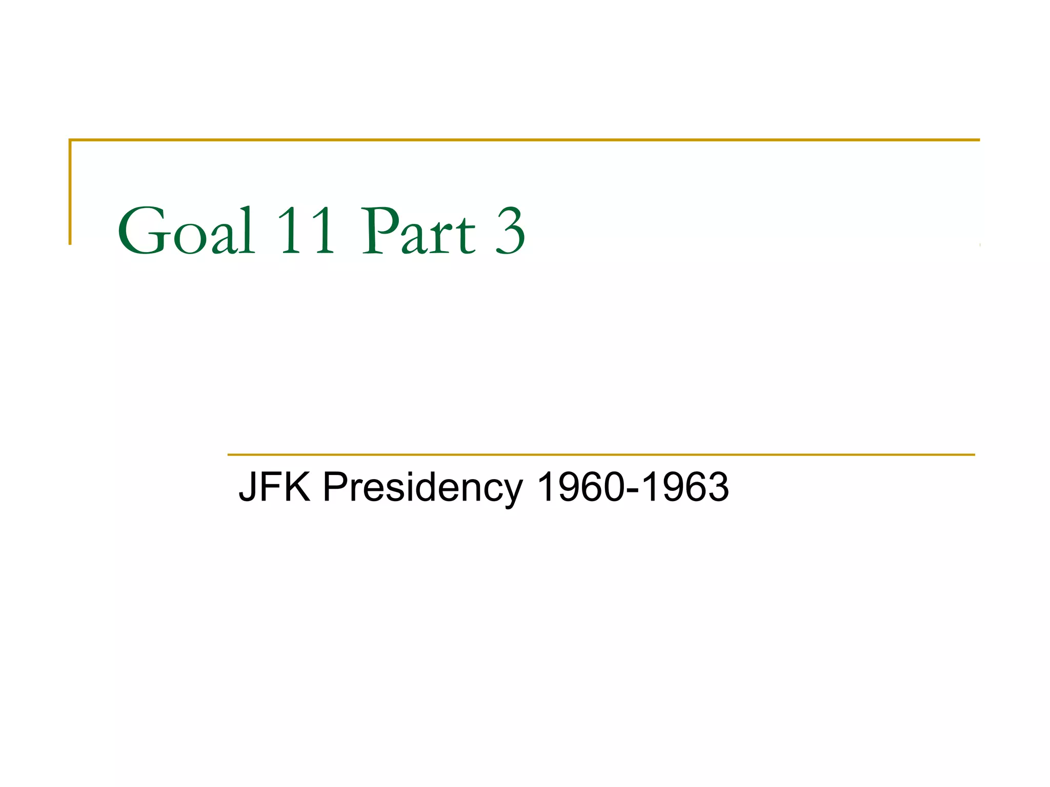 1) JFK was elected in 1960, becoming the youngest ever U.S. president. 2) His New Frontier programs aimed to improve the economy, assist the poor, advance space exploration, and increase international aid. 3) The failed Bay of Pigs invasion damaged America's reputation.
