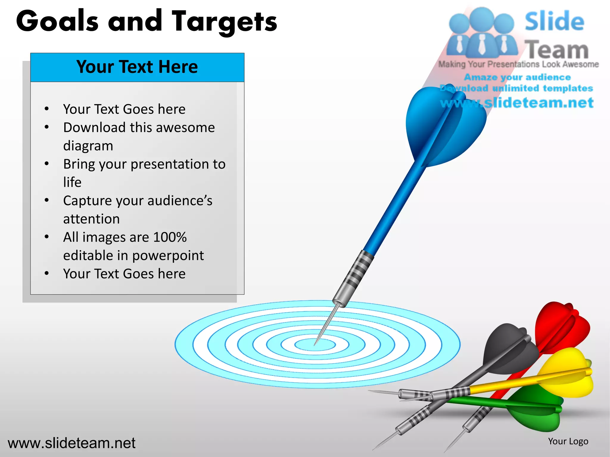 The document discusses goals and targets for a presentation. It contains repetitive text highlighting how the presentation can be customized with editable diagrams, bring the presentation to life, capture audience attention, and use 100% editable images in PowerPoint. The document also discusses how to ungroup and edit objects and change their color in PowerPoint.