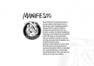 Goat Collective is a diverse group of young creatives passionate about positive change. They provide various artistic services to meet clients' specific needs. Income from commercial projects will fund social and political work. As an investor, clients help support this mission. The collective operates without a rigid hierarchy and members manage their own time and projects.