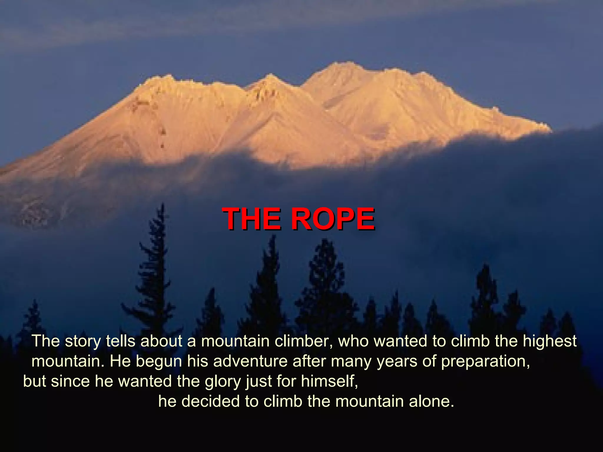 The story is about a mountain climber who wanted to climb the highest mountain alone for glory. As he neared the top at nightfall, he slipped and fell in the darkness. Hanging from his rope, he prayed to God for help. A voice from above told him to cut the rope, but he held on for dear life. The next day rescuers found his frozen body just 10 feet from the ground, hands still clutching the rope. The moral is about clinging tightly to God rather than letting go of earthly attachments.