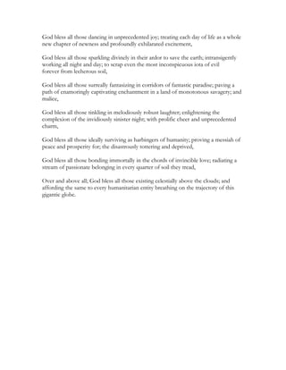 The document blesses all people who work to uplift humanity through philanthropic acts, spread peace, and march forward achieving their dreams of symbiotic survival with others. It also blesses those who propagate art, embrace harmony, diffuse religious humanity, help the oppressed, impart strength to the vulnerable, fulfill their duties without complaint, transcend difficulties with smiles, ignite happiness in despair, spread honesty, treat each day with joy, work tirelessly to erase evil, pave enchanting paths, enlighten the night with laughter, survive as harbingers of peace, and radiate love.