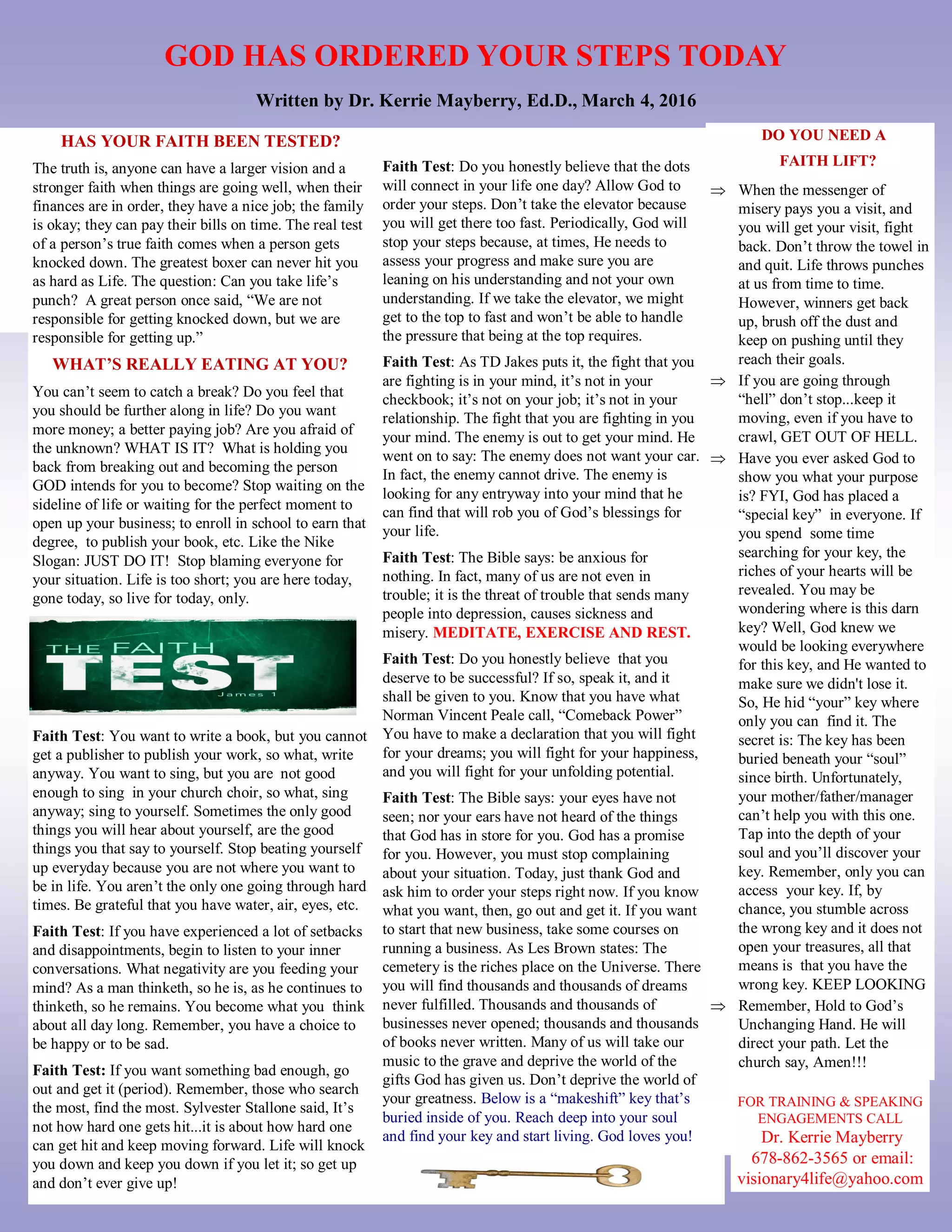 The document discusses facing challenges to one's faith when experiencing difficulties in life. It encourages the reader to not give up on their dreams and goals when facing setbacks, and to keep pursuing what they want in life through faith and hard work. It suggests focusing on inner positivity and allowing God to guide one's path, rather than dwelling on negatives or blaming others. The key is to get back up when knocked down and keep moving forward through perseverance.