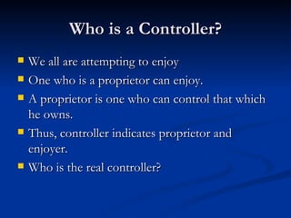 The document discusses the concept of God as the supreme controller according to the Bhagavad Gita. It states that God is the true proprietor and enjoyer of all things. It then provides several verses from the Gita to support this, showing that God controls material nature and the actions of living beings, and that one can attain peace by understanding God to be the supreme controller, supreme proprietor of all, and the true well-wisher of all living beings. It concludes by outlining a three-fold path to peace through devotional service and chanting the holy names of God.