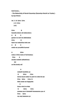 The document appears to be lyrics to a song titled "God knows..." that discusses longing for a person despite the difficulties of the world, promising to continue walking together down a future path, and wishing for God's blessing on the two people. The lyrics express feelings of love, strength, and fate while acknowledging that ultimately "everything is known by God."