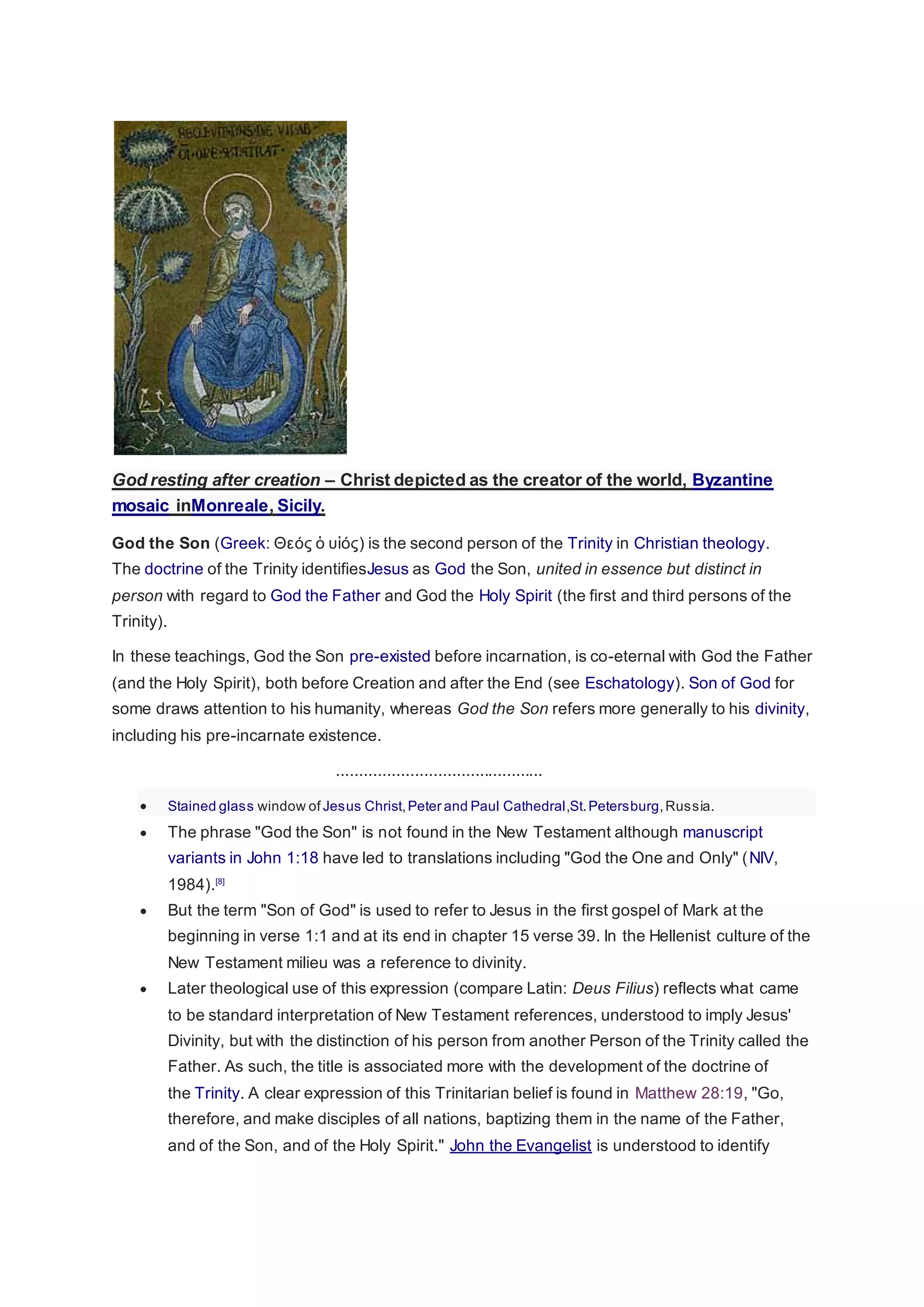 God the Son is the second person of the Trinity in Christian theology. The doctrine of the Trinity identifies Jesus as God the Son, who is co-eternal with and united in essence to God the Father and God the Holy Spirit. As the second person of the Trinity, God the Son pre-existed before his incarnation as Jesus and continues to exist after with the Father and Holy Spirit. The term "God the Son" reflects the later theological understanding of Jesus' divinity derived from interpretations of references to him as the "Son of God" in the New Testament.