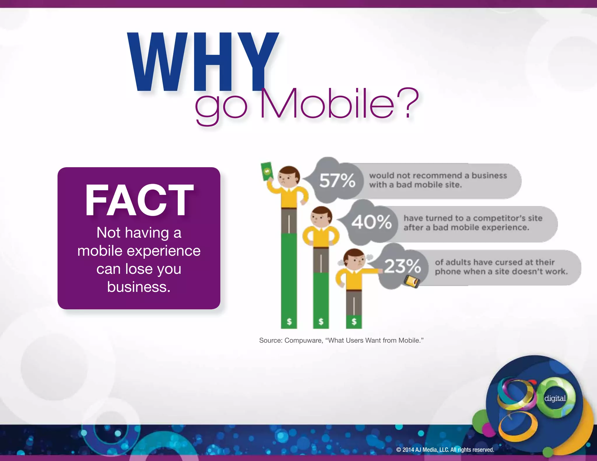 The document discusses why businesses need a mobile experience and presence. It outlines 5 reasons for businesses to go mobile, including connecting with customers anywhere, driving customers to stores, increasing productivity, avoiding lost business, and growing the business. The document also discusses the advantages of mobile websites and mobile apps, noting that customers prefer apps over mobile websites. It provides examples of features that can be included in a mobile app to engage customers.