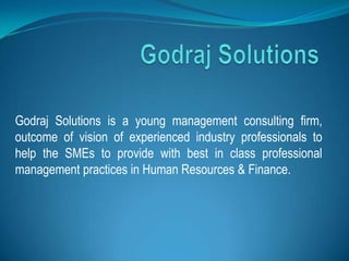Godraj Solutions is a young management consulting firm founded by experienced industry professionals to provide SMEs with best-in-class professional management practices in human resources and finance. The firm aims to be a trusted business partner providing broad HR and financial solutions to clients across India. It focuses on staffing solutions, HR consulting, training, and financial consulting for clients in various industries such as BFSI, IT & ITES, FMCG, pharma & life sciences, hospitality, and education.