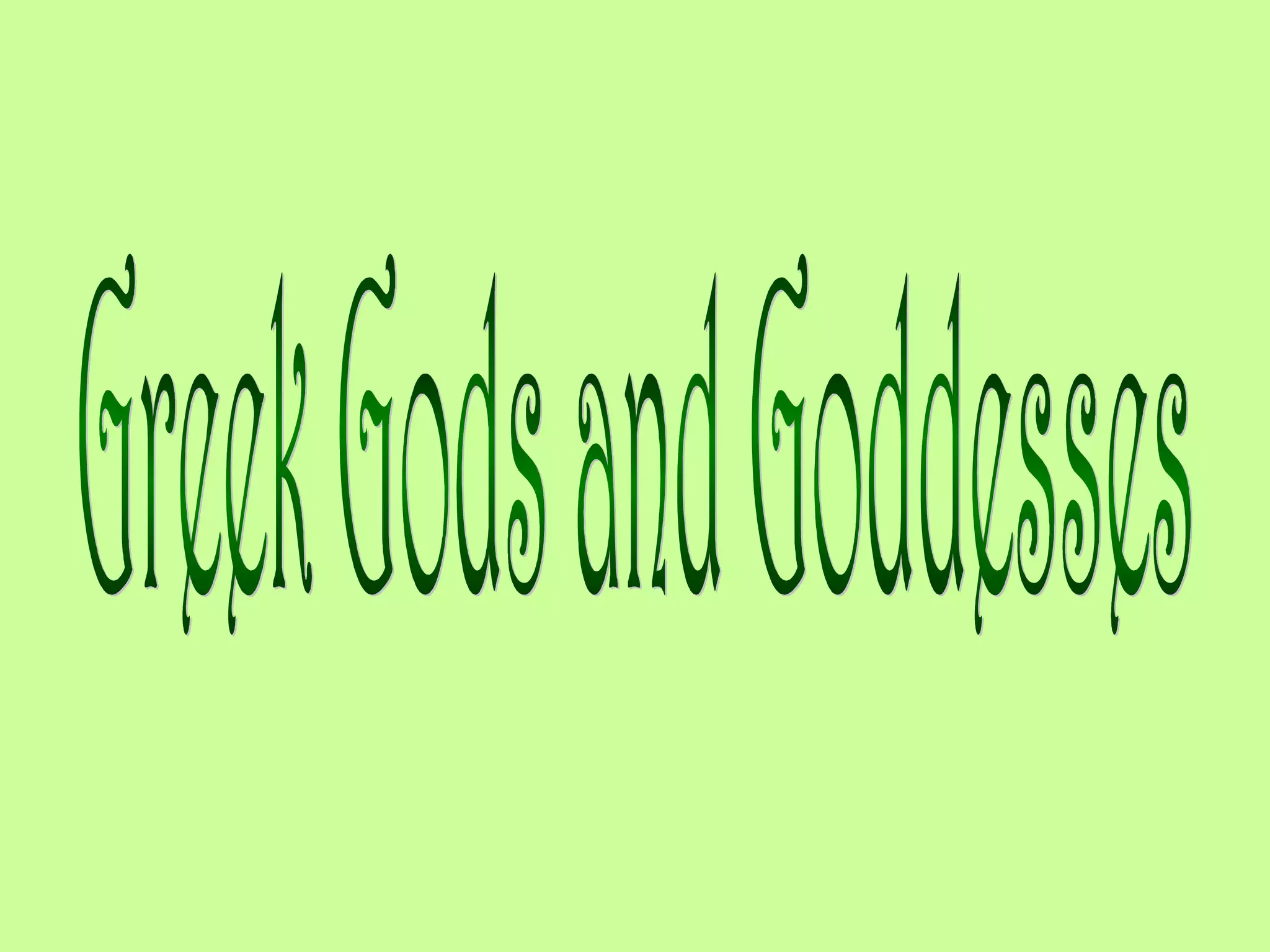 The document describes the major gods and goddesses of Greek mythology. Zeus was the supreme god and ruler of the Olympians. Hera was the goddess of marriage and wife of Zeus. Aphrodite was the goddess of love, beauty, and fertility as well as a protectress of sailors. The gods and goddesses described include Ares, god of war; Hephaestus, god of fire and crafts; Artemis, goddess of the hunt; Dionysus, god of wine; Hermes, messenger of the gods; Poseidon, god of the sea; Apollo, god of prophesy, music and healing; Athena, goddess of crafts and wisdom; Demeter,