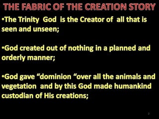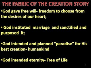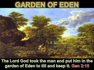 God created man in His image to live in paradise in the Garden of Eden. However, man disobeyed God and was tempted by the serpent to eat from the forbidden tree. This original sin resulted in mankind losing their immortality and communion with God. As a consequence of Adam's sin, all of humanity is now subject to suffering, sin, and death. God remained merciful, however, and promised a savior who would defeat sin and the devil.