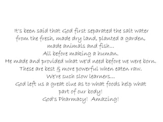 This document discusses how various foods resemble different parts of the human body and contain nutrients that benefit those corresponding organs or systems. It provides several examples of fruits and vegetables that visually look like eyes, hearts, brains, kidneys, bones, female reproductive organs, and other body parts, and scientific research showing they positively impact the health of those areas. The overall message is that God designed foods to naturally help and heal the human body.