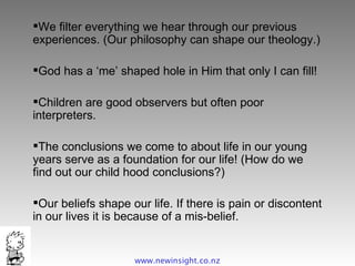 The document discusses how our beliefs shape our lives and relationships. It argues that if we have pain or discontent, it is likely due to misbeliefs formed from our childhood experiences and conclusions. It provides several examples of common misbeliefs that people hold which can negatively impact their lives if not addressed, such as believing that their worth depends on appearance or that assertiveness equals aggression. The document advocates pondering how much God loves us in order to feel His divine love.