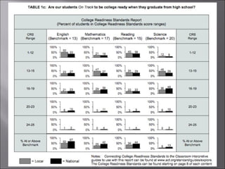 #5 This slide breaks down our students college readiness. As you can see we are behind the national average in all subject areas. The science component is extremely low, not only for us but the nation as well. This is an area that needs to have a strong focus in the upcoming year.