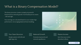 Binary Compensation Plan Overview – Understand how the binary system structures two legs—left and right—and pays commissions based on the volume of your weaker leg