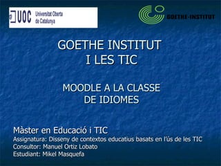 GOETHE INSTITUT I LES TIC MOODLE A LA CLASSE DE IDIOMES Màster en Educació i TIC Assignatura: Disseny de contextos educatius basats en l’ús de les TIC Consultor: Manuel Ortiz Lobato Estudiant: Mikel Masquefa