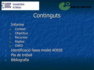 Continguts Informe ContextObjectius Recursos Reptes DAFO Identificació fases model ADDIE Pla de treball Bibliografía