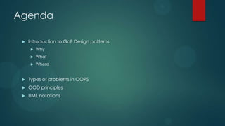 The document provides an overview of the GoF design patterns including the types (creational, structural, behavioral), examples of common patterns like factory, abstract factory, singleton, adapter, facade, iterator, observer, and strategy, and UML diagrams illustrating how the patterns can be implemented. Key aspects of each pattern like intent, relationships, pros and cons are discussed at a high level. The document is intended to introduce software engineers to design patterns and how they can be applied.