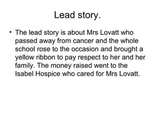 The school magazine discusses Mrs. Lovatt, a beloved P.E. teacher and head of house who recently passed away from cancer. The school and community came together to honor her memory by wearing yellow ribbons and raising money for the hospice that cared for her in her final days. An upcoming charity run will also benefit the hospice in recognition of Mrs. Lovatt's positive spirit and contributions to the school through her coaching and leadership.