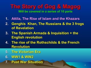 1) The document discusses the prophecy of Gog and Magog from Ezekiel and provides an alternative interpretation that it is being fulfilled covertly over centuries, not as a single future event.