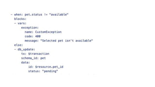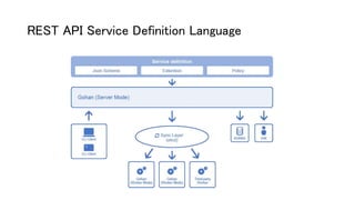 The document outlines Gohan, a YAML-based REST API service definition language that supports API definition generation, database mapping, and custom logic through Gohan Script. It includes features like role-based access control, integration with etcd, and benchmarking results for performance with various configurations. Future development plans focus on enhancing performance, supporting additional authentication methods, and code generation.