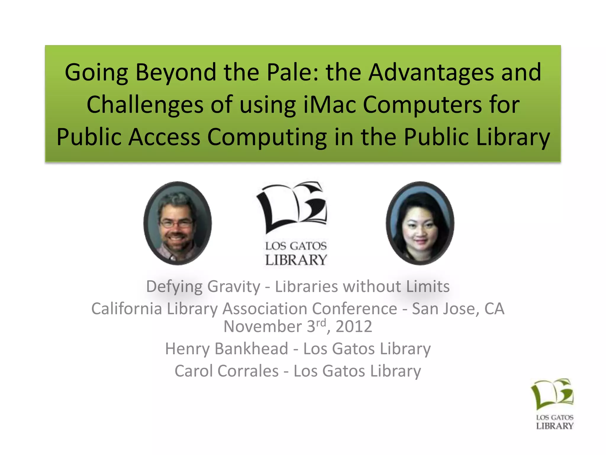 The document discusses the advantages and challenges of using iMac computers for public access in libraries, highlighting their user-friendly features and potential issues related to cost and administration. It provides an overview of the transition to iMacs in a new library, outlining improvements in user experience, public access computer availability, and print management. The authors emphasize the mixed familiarity of patrons with Mac systems, which can lead to both engagement and confusion.