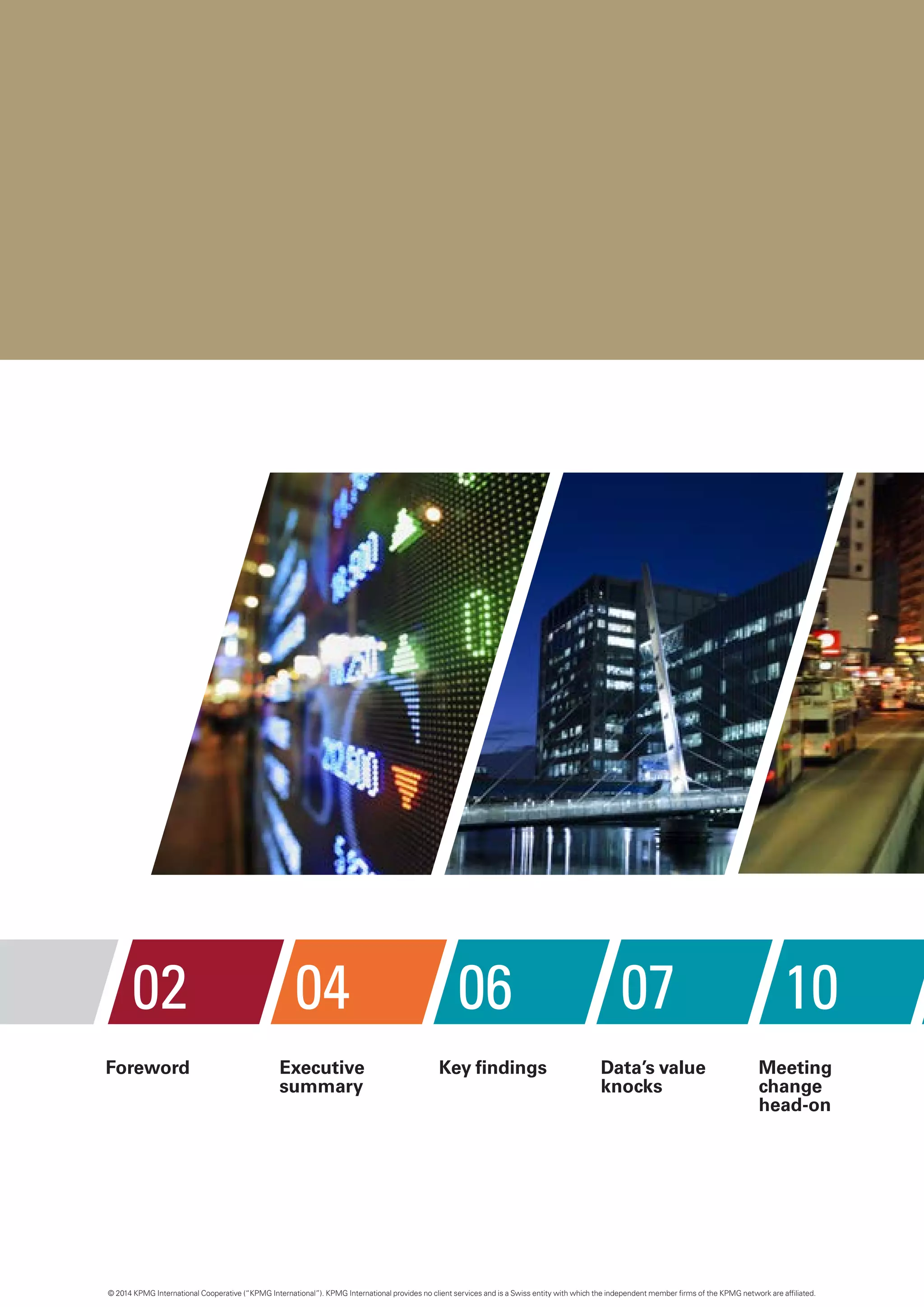The document discusses the findings of a survey of 144 CFOs and CIOs about their companies' use of data and analytics (D&A). It finds that while most companies recognize D&A's importance, many are still struggling to realize its full potential benefits. Specifically, the majority have difficulty integrating data technology, analyzing data accurately, and identifying the right data to collect for their D&A strategies. The document maintains that fully leveraging D&A can provide significant competitive advantages but many companies have yet to develop the right environment and understanding to do so.