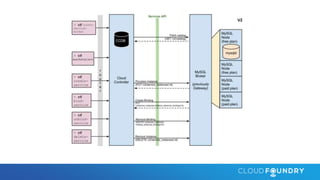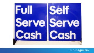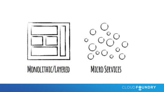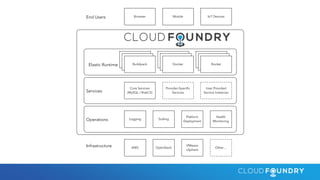 This document discusses key aspects of cloud native applications and platforms. It notes there is consensus around cloud native traits like containers, microservices, platform independence, and automation. Cloud Foundry is presented as a platform that can deploy and manage cloud native applications by providing automated scaling, routing, service integration, and other capabilities through declarative configuration. The platform handles tasks like detecting application frameworks, linking to services, self-service deployment, routing, versioning, upgrades, scaling, and more through simple commands. This allows developers to focus on their code while the platform manages the complex runtime environment.