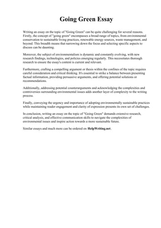 Going Green Essay discusses the challenges of writing an essay on environmental sustainability. It notes that the topic of "going green" covers a broad range of issues from conservation to renewable energy. It also states that environmentalism constantly evolves, requiring thorough research. Additionally, crafting an argument within this broad topic requires careful consideration of factual information and counterarguments. Finally, conveying urgency around sustainability while maintaining reader engagement adds further complexity.