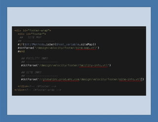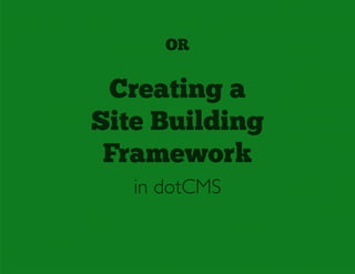The document discusses the strategy for converting 700 websites to dotCMS using conventions for HTML, CSS, JavaScript, and Velocity to ensure consistency and efficiency. It emphasizes the importance of a shared framework to reduce redundancy, enhance collaboration, and improve implementation processes in site building. By utilizing a global host for reusable components and styles, the approach aims to streamline development while maintaining quality control across sites.