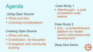 The document discusses the advantages and considerations of adopting open source software for small teams, emphasizing the importance of intentional use and appropriate licensing. It presents case studies of two open source projects, Afterthought and Exo, highlighting their functionalities, community engagement, and future plans. The conclusion stresses the balance between maintaining proprietary business interests and contributing valuable resources to the open source community.