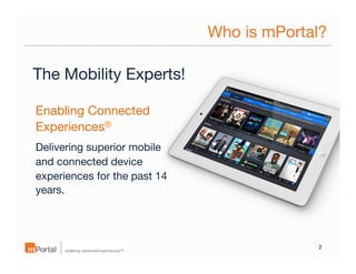 The document provides an overview of mPortal's Springboard software platform, which enables service providers to deliver communication, collaboration, and entertainment services across connected devices. It details the platform's features, such as integration with multiple content sources, support for social interactions, and tools for content discovery and video streaming. Additionally, it highlights how Springboard helps strengthen user engagement and loyalty while allowing service providers to maintain control over their offerings.