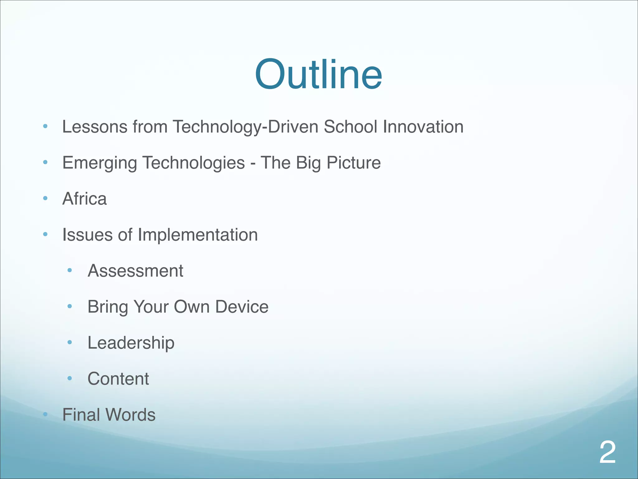 This document discusses emerging technologies that can support individualized learning. It outlines lessons learned from technology-driven school innovations, including balancing investment in technology with pedagogical knowledge. Emerging technologies that may be adopted in the next 1-5 years are discussed, including cloud computing, mobile learning, learning analytics, and 3D printing. Issues around implementing technologies in schools are also addressed, such as developing teacher competence, leadership, and assessment strategies. The document advocates for holistic approaches to technology implementation that focus on curriculum, assessment, and professional development.