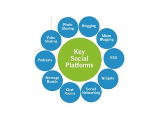 The document presents a discussion on the integration of social media within organizations, emphasizing its role in community engagement and communication. It outlines the evolution of the web from broadcast to dialogic interactions, highlighting the need for organizations to adapt to digital communication methods and tools. The presentation includes strategies for setting goals, measuring success, and the importance of engaging leadership and understanding audiences in building successful social media initiatives.