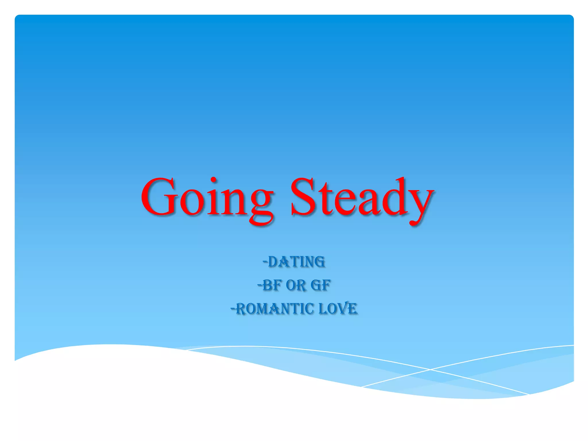 The document discusses the concepts of "going steady," dating, and romantic love during middle school years. Going steady means exclusively dating one person without seeing others, and typically involves introducing your partner to friends. It can progress to officially labeling your partner as your boyfriend or girlfriend. Romantic love in this stage is deeper than infatuation and involves fantasy, idealization, and feeling comfortable with each other. Common dating activities during this period include giving flowers, going to restaurants, hugging, and holding hands.