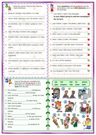 This document provides examples of using the be going to construction to talk about plans and predictions for the future. It demonstrates forming affirmative, negative, and interrogative sentences with be going to and includes exercises for learners to practice using be going to in their own sentences.