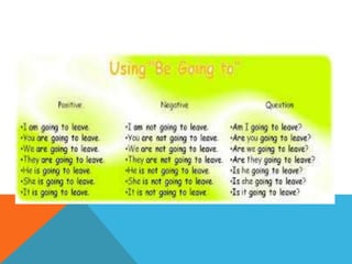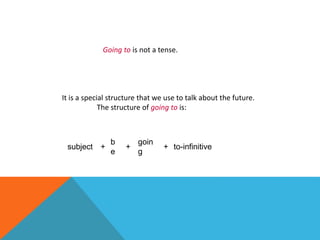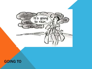 Going to is used to talk about the future based on present intentions or evidence. It has the structure of subject + be + going + to-infinitive. Going to expresses intention when a decision has already been made before speaking, such as saying "I'm going to buy a car" after winning the lottery. Going to also makes predictions about the future based on present circumstances, like predicting "It's going to snow" when seeing a dark sky.