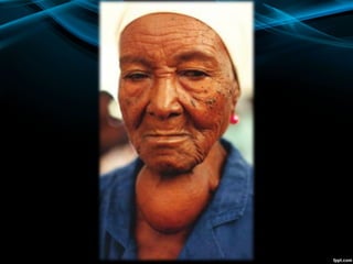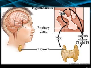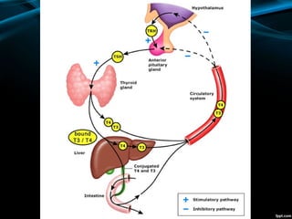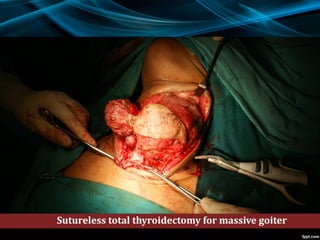 The document discusses the physiology of the thyroid gland and thyroid hormones such as T3 and T4. It describes how the pituitary-thyroid axis controls thyroid hormone production and discusses different types of thyroid enlargement including simple goiter, diffuse hyperplastic goiter, toxic nodular goiter, and Graves' disease. The principles and advantages/disadvantages of different treatment approaches for hyperthyroidism are provided, including anti-thyroid drugs, surgery, and radioiodine therapy. Potential postoperative complications of thyroid surgery are also listed.