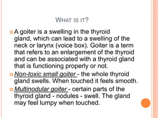 A goiter is a swelling of the thyroid gland in the neck. It can be caused by an overactive or underactive thyroid. Goiters are more common in women, older people, and those from areas without iodized salt. Small goiters may disappear on their own but large goiters can press on the trachea and cause breathing problems. Treatment options include thyroid medication, surgery to remove parts of the thyroid, or removal of the entire thyroid gland. Preventing iodine deficiency through iodized salt can help prevent endemic goiters.