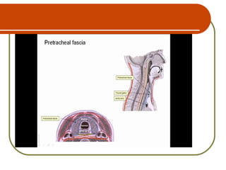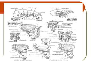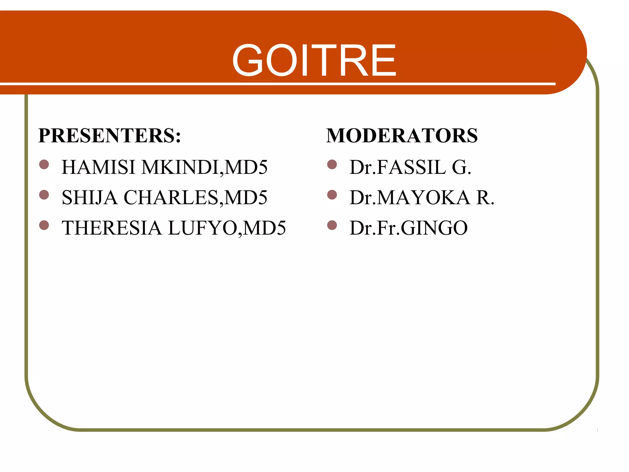This document provides an overview of goiter (enlargement of the thyroid gland). It defines goiter and discusses the surgical anatomy and embryology of the thyroid gland. It covers the etiology, classification, pathophysiology, clinical presentation, workup, treatment, and complications of goiter. The document also discusses prevention of goiter through primary, secondary and tertiary prevention measures.
