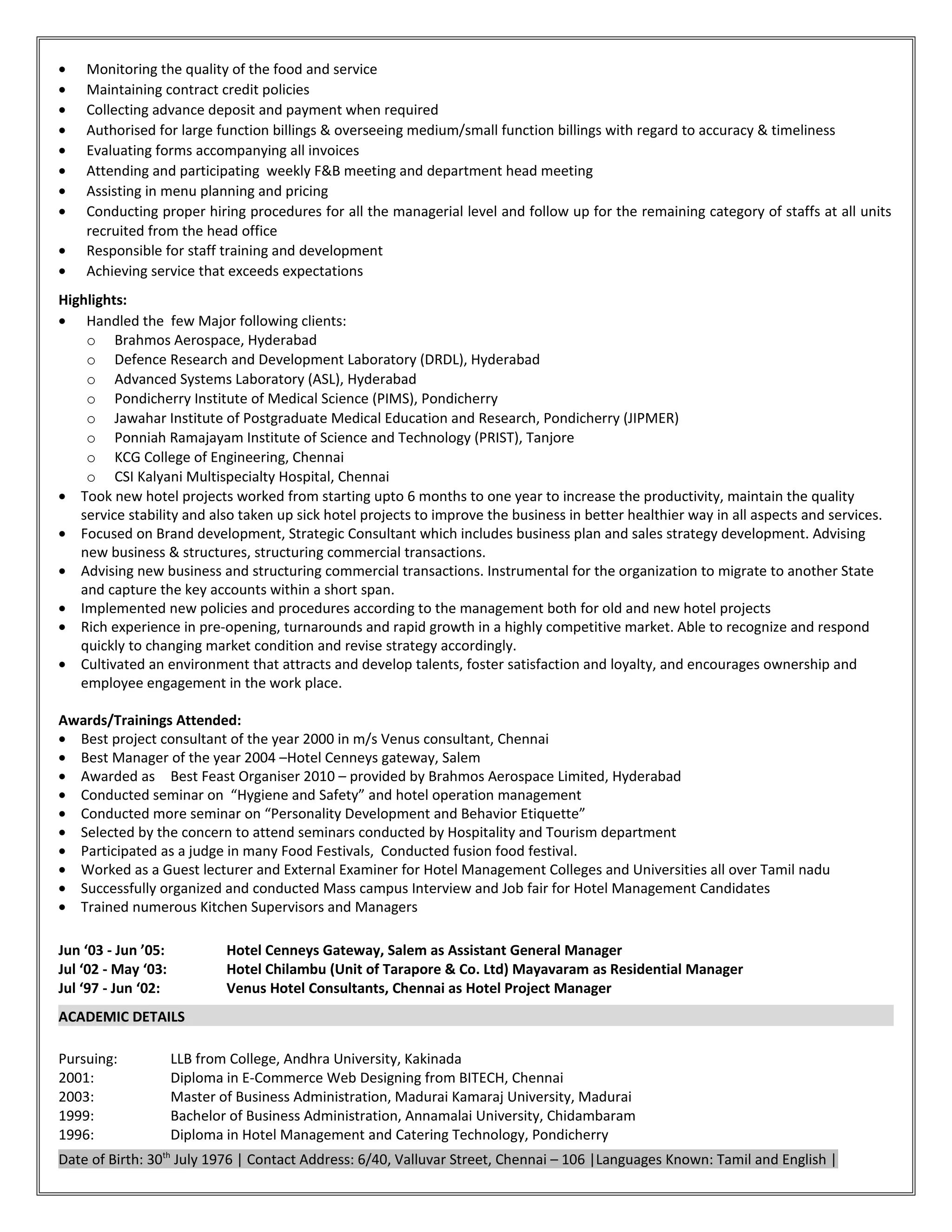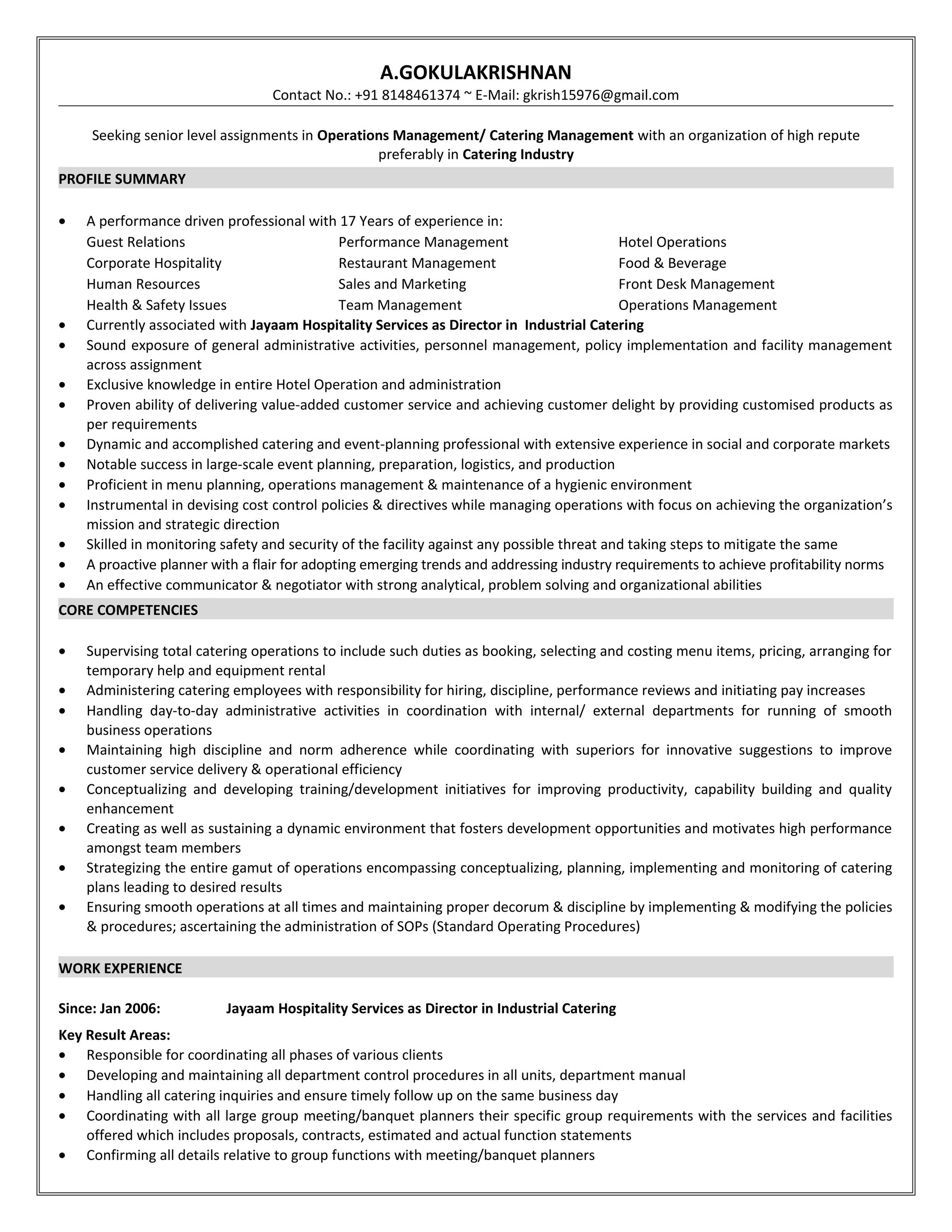 The document is a resume for A.Gokulakrishnan seeking a senior level position in operations or catering management. It summarizes his 17 years of experience in various hospitality roles, including his current role as Director of Industrial Catering. It also lists his educational background and qualifications.