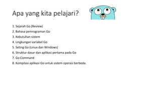 Dokumen ini membahas tentang pembelajaran bahasa pemrograman Go, meliputi sejarah, fitur, persyaratan sistem, variabel lingkungan, cara pengaturan, struktur dasar aplikasi, perintah Go, dan kompilasi untuk sistem operasi lain.