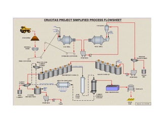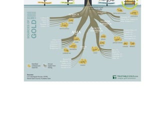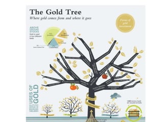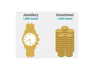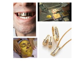 Gold is a rare precious metal that is soft and highly malleable. It has various industrial and decorative uses. The document outlines the processes for extracting gold from ore, including comminution, cyanidation, and carbon-in-pulp extraction. It also describes the process for making gold jewelry through wax carving, investment casting, burnout, and polishing the final casting. The price of gold fluctuates based on supply and demand factors, and carat refers to the purity of gold alloys.