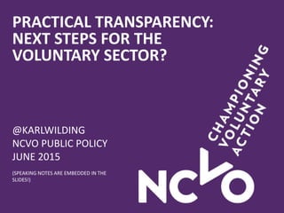 This document discusses transparency in the voluntary sector and proposes next steps. It addresses how transparency relates to an organization's impact, funding, operations, governance, services, research, and campaigning. While transparency is important, fully openness must be balanced with protecting privacy and operations. The document suggests voluntary sector organizations could further transparency by openly sharing more outcomes data, budgets, strategies and decisions to build greater public trust and accountability.