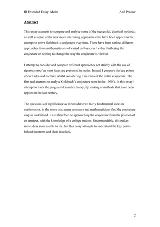1) Various approaches have attempted to prove Goldbach's conjecture that every even integer can be expressed as the sum of two primes (binary conjecture) and every odd integer as the sum of three primes (ternary conjecture).