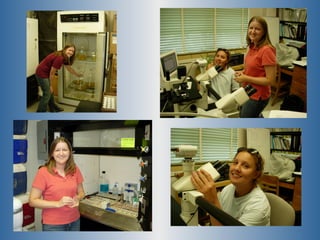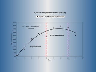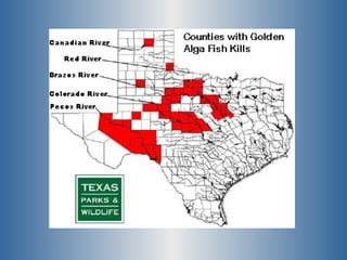 This document summarizes research on the golden algae Prymnesium parvum. It describes the organism's characteristics, environmental impacts from toxic algal blooms, and methods to identify and detect P. parvum. Experiments analyzed changes in pigmentation and optical absorption signatures over the algae's growth cycle. Results showed pigmentation ratios varied too much to use for detection, but optical signatures remained consistent, allowing rapid detection through remote sensing of blooms.