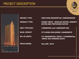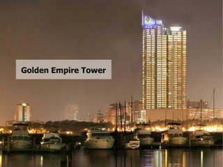The Golden Empire Tower project involves developing a 57-floor high-rise residential condominium building with 317 residential units in Manila, Philippines. It will be the tallest residential building in the country. The building will feature luxury condominium units along with commercial spaces and amenities on the lower floors such as pools, a gym, and a putting green. The project aims to set new standards for high-rise living in the metro.